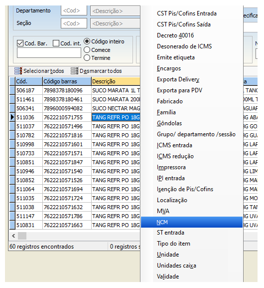 Acesso a página: Dentro do ERP > clique no Menu > Manutenção de cadastro de produtos Caso a pesquisa seja por "parte de descrição", clique no campo e digite um trecho do nome e clique em pesquisar, no exemplo foi digitado "tang", após aparecer os itens, selecione os itens que deseja alterar a informação e em seguida clique com o botão direito do mouse, com isso irá aparecer as opções(campos) que estão disponiveis para alteração.